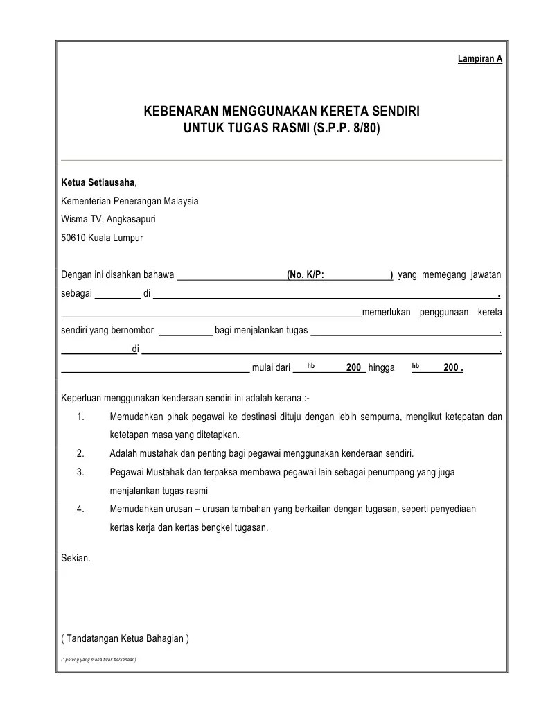 Contoh format surat rasmi kebenaran menggunakan kebenaran bagi pegawai kerajaan. Adalah diluluskan untuk menggunakan kereta sendiri bagi menjalankan tugas rasmi ke . 860323525902 untuk menggunakan kenderaan saya bernombor pendaftaran qbc5112 kereta alza atas sebab urusan rasmi.
