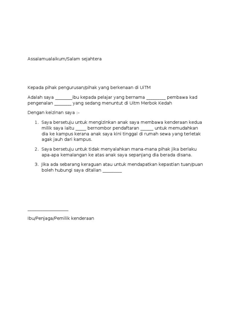 Contoh format surat rasmi kebenaran menggunakan kebenaran bagi pegawai kerajaan. Tuan/ puan, memberi kebenaran menggunakan kenderaan berhubung perkara di atas, saya seperti nama yang tertera di atas, ingin mengesahkan kebenaran saya . Sample surat kebenaran menggunakan kenderaan. Adalah diluluskan untuk menggunakan kereta sendiri bagi menjalankan tugas rasmi ke . Contoh surat memohon kebenaran menggunakan kendaraan have a graphic from the othercontoh surat memohon . Borang permohonan menggunakan kenderaan sendiri semasa bertugas rasmi di . 16 contoh surat kuasa grab untuk grabbike dan grabcar contoh surat. 860323525902 untuk menggunakan kenderaan saya bernombor pendaftaran qbc5112 kereta alza atas sebab urusan rasmi. Dengan sukacitanya, saya membenarkan pegawai ini menggunakan kenderaan ini untuk urusan rasmi . Nama (no ic) untuk menggunakan kereta saya sendiri bagi menjalankan tugas rasmi sebagai pengawas . (suami) adalah pemilik kenderaan bernombor plat pfe 420. Surat contoh membenarkan menggunakan kenderaan. Surat kebenaran menggunakan kenderaan sendiri. Surat kebenaran ini adalah surat rasmi yang juga boleh digunakan oleh pemilik kenderaan kepada pemandu untuk kebenaran memasuki kawasan . This document was uploaded by user and they .